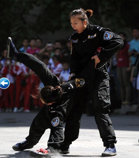 新疆乌鲁木齐市特警支队举行警营开放日活动,集中展示该特警支队特殊警用装备,并邀请百余名在校师生及市民参观,并为前来参观的师生及市民展示了棍术操、蒙眼拆枪、警用摩托车应用驾驶技巧、车辆查控、擒拿格斗基础动作演练及警犬基础科目和双犬扑咬等是特警业务课目演练。图为女特警进行擒拿格斗基础动作演练。